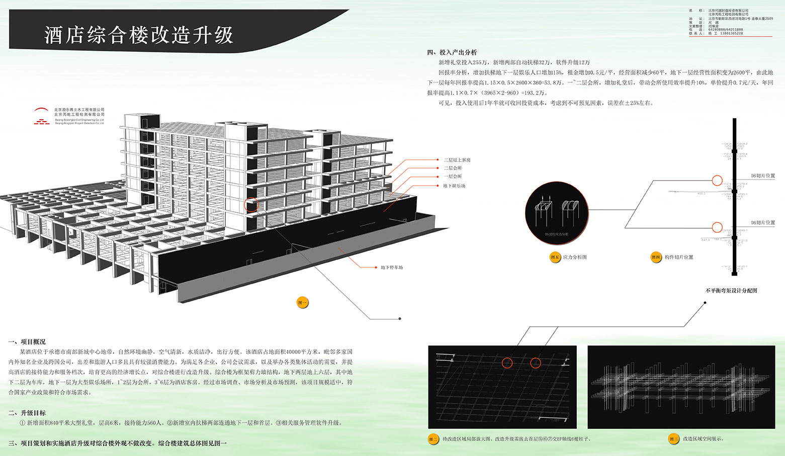 某酒店位于承德市南部新城中心地带,自然环境幽静,空气清新,水质洁净,出行方便。该酒店占地面积40000平方米,毗邻多家国内外知名企业及跨国公司,出差和旅游人口多且具有较强消费能力。为满足各企业、公司会议需求,以及举办各类集体活动的需要,并提高酒店的接待能力和服务档次,培育更高的经济增长点,对综合楼进行改造升级。综合楼为框架剪力墙结构,地下两层地上六层,其中地下二层为车库,地下一层为大型娱乐场所,1~2层为会所,3~6层为酒店客房。经过市场调查、市场分析及市场预测,该项目规模适中,符合国家产业政策和符合市场需求。