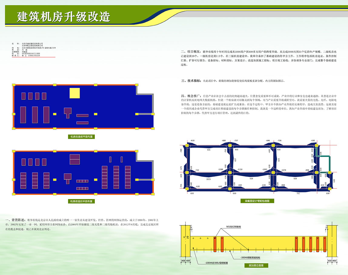 二、项目概况:歌华有线用十年时间完成从5000用户到400多万用户的跨度升级,从完成3000万到35个亿的年产规模,二级机房也已建设到19个,一级机房达到113个,在二级机房建设中,我单位承担了基础建设的待甲方工作,工作程序包括机房选址、条件控制汇报、扩容可行报告。设备招标、材料招标、方案设计、改造加固施工招标、项目竣工验收,并协调各专业部门,完成整个基础建设过程。