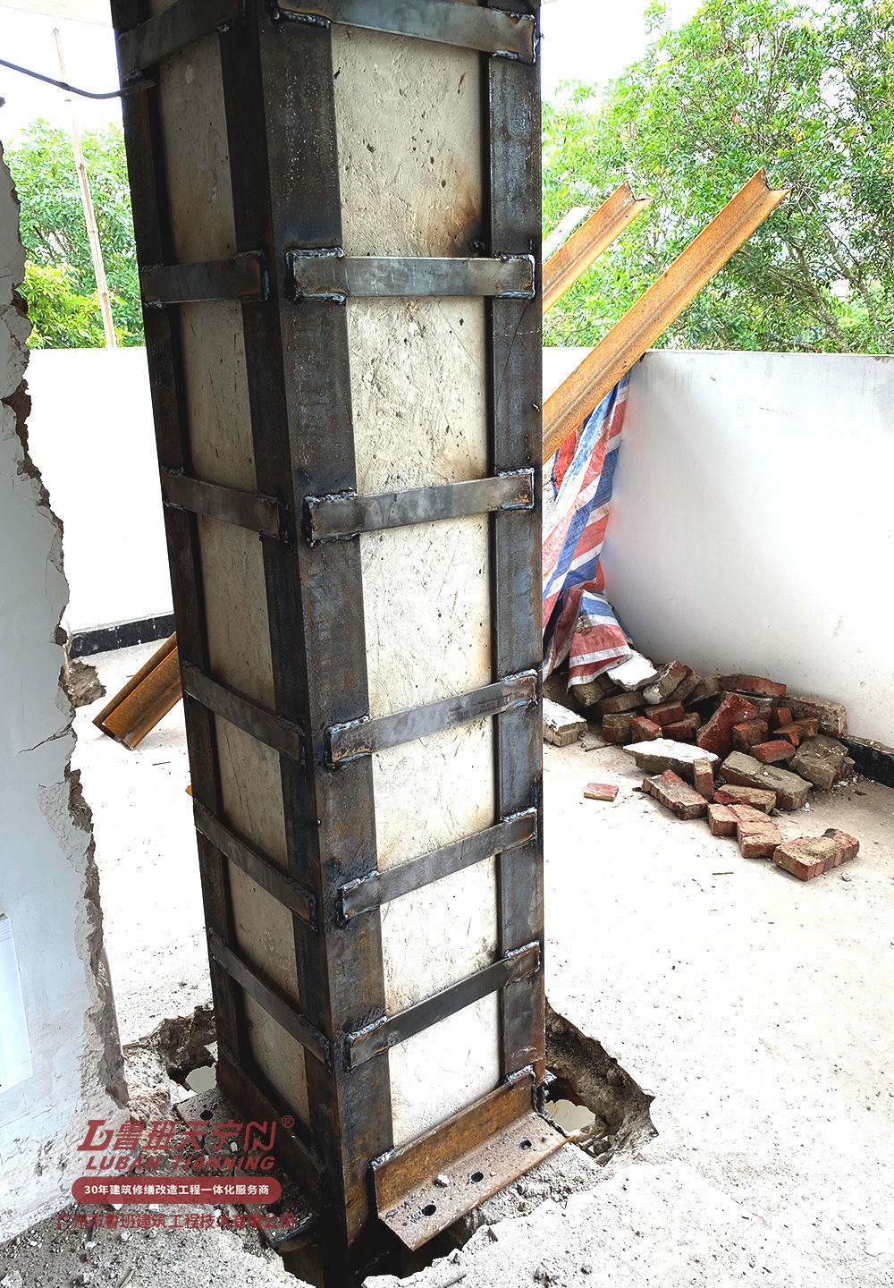 柱外包钢加固法是在柱两角或四角外包型钢或角钢的一种加固方法。在混凝土构件表面与外包钢缝隙间灌注高强水泥砂浆或环氧树脂浆料,同时利用横向缀板或套箍作为连接件,通过高性能配套粘结材料使其两者共同作用受力,以提高构件的承载能力及整体受力性能。